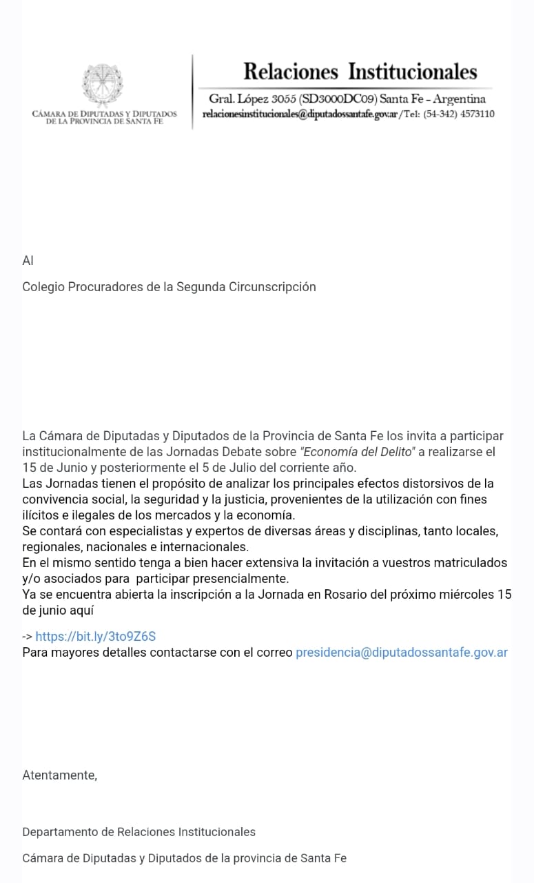 La Cámara de Diputados y Diputadas ha invitado al Presidente del Colegio de Procuradores de Rosario, haciéndolo extensivo a todos sus matriculados.